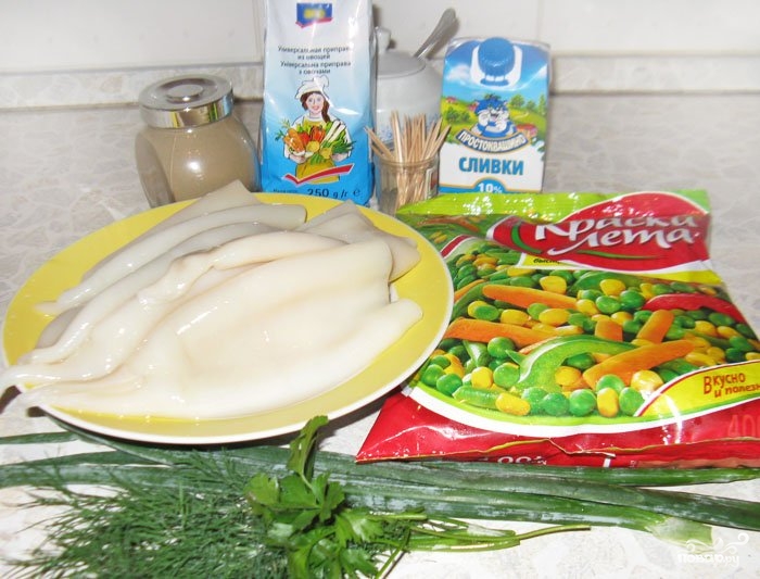 1. Вот такой яркий и аппетитный набор ингредиентов необходим, чтобы повторить этот простой рецепт кальмаров, фаршированных овощами, на вашей кухне.