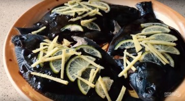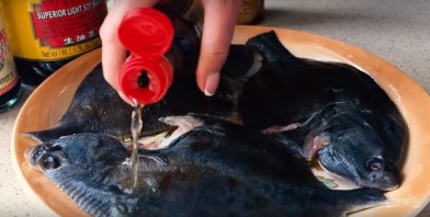 5. Под рыбу кладем имбирь и тонко нарезанный лимон. Делаем это для запаха. Берем рыбный соус, хорошенько поливаем им камбалу.