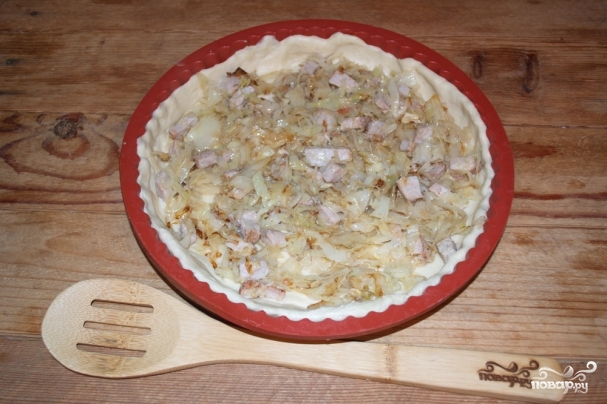 В форму с тестом выложите приготовленную начинку. Взбейте яйцо с молоком. Яичной массой залейте начинку пирога. Разогрейте духовку до 200 градусов, запекайте пирог до 45 минут (до готовности).