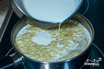 Затем влейте молоко. Закройте кашу крышкой и варите на медленном огне до готовности. Это займет еще около 10-15 минут.