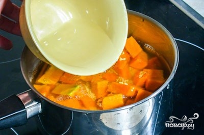 Пшено засыпьте на дно кастрюли. Добавьте к нему тыкву и залейте горячей водой. Посолите. Выпарите воду на небольшом огне, снимая пенку.