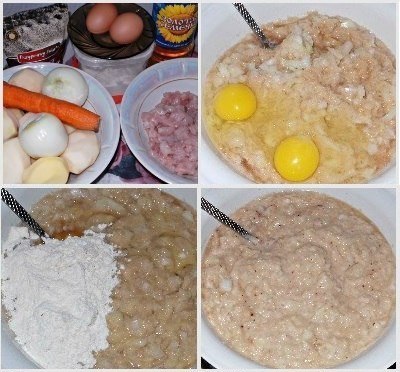 Добавить,лук, муку, соль, перец, яйца,специи - все хорошо перемешать,на разогретую сковороду наливаем растительное масло, кладем по ложке картофеля, затем небольшие кругляшки начинки и наверх снова кладем ложку картофельной массы так, чтобы не было просветов.
