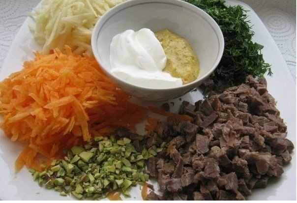 Если этот салат будете подавать в салатнице - тогда овощи натрите на более крупной тёрке, а мясо разберите на волокна.