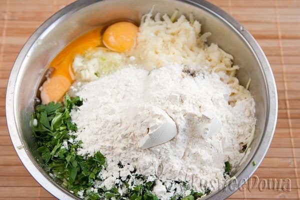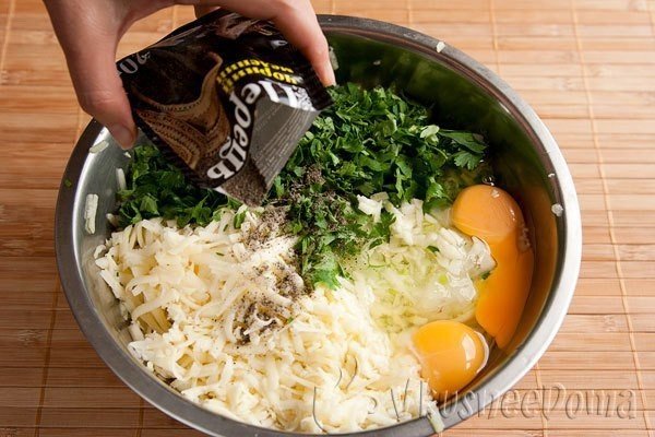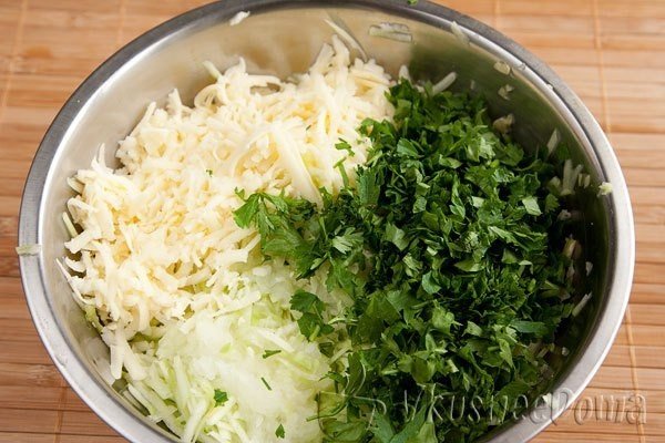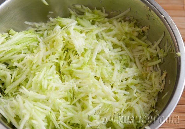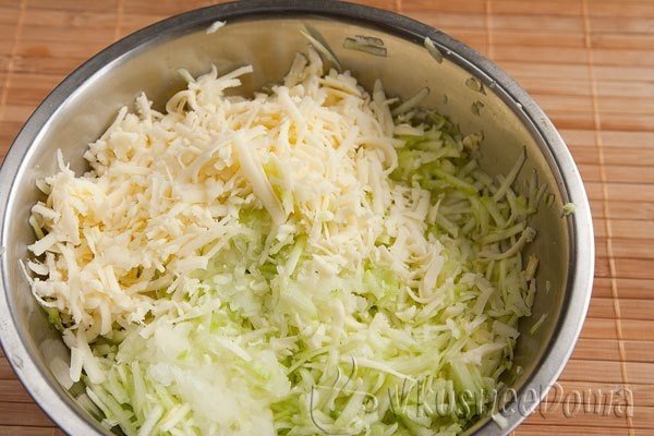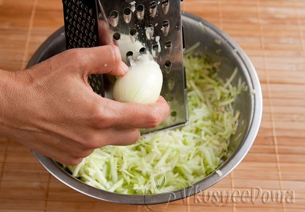 Добавляем лук тоже натертый на терке. Даже мелко нарезанный лук будет чувствоваться в мягкой консистенции кабачка.