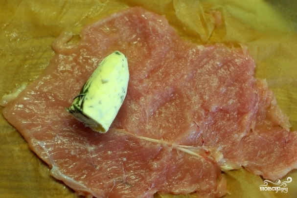 Каждый кусочек масла плотно заворачиваем в куриное филе.