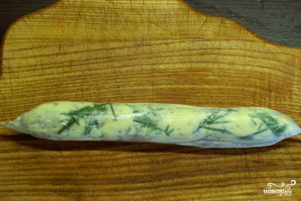 Хорошенько разминаем масло со специями вилочкой. Получившуюся массу выкладываем полоской на пищевую пленку.