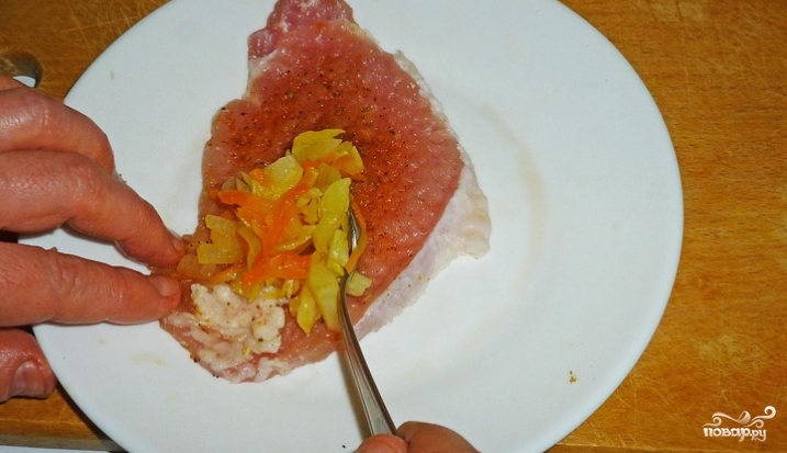 На каждый кусок мяса кладем по 2 ч.л. овощной начинки.