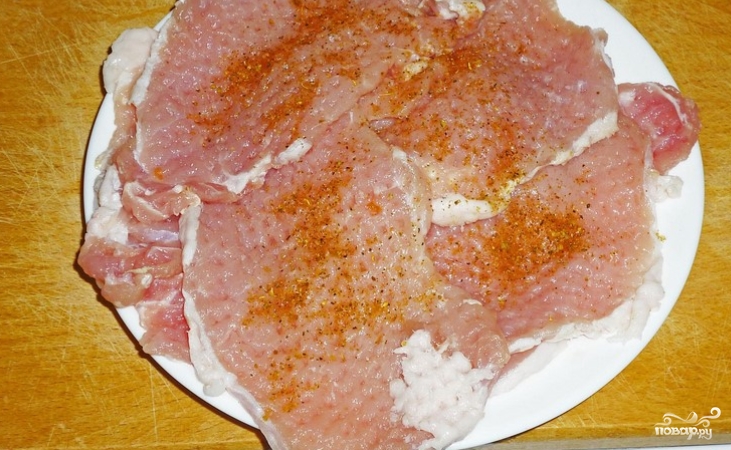 Свиную вырезку нарезаем порционными кусочками. Каждый кусок отбиваем и присыпаем с обеих сторон солью и перцем.