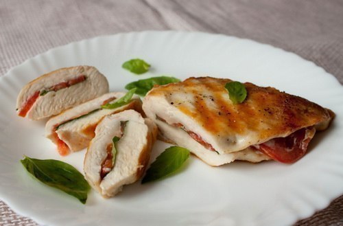 “Ужин за 30 минут”. За счет ломтиков сочного помидора, которыми нафарщированы грудки, мясо получается сочным и очень вкусным. А базилик придает особенный аромат этому блюду.