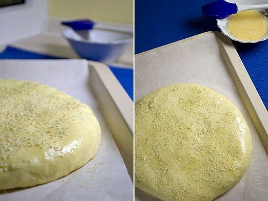 Загнуть края верхнего круга под нижний круг. Смазать лепешку яйцом, посыпать кунжутом и выпекать 20-30 минут до золотистого цвета.