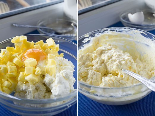 Смешать творог с маслом, добавить яйцо, перемешать.