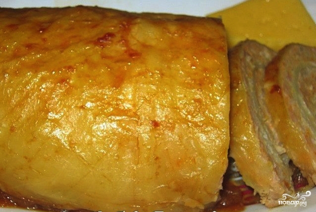 На дно сотейника или гусятницы выложите обрезки капустных листьев, влейте туда 100 мл. воды или бульона. Аккуратно выложите рулет на дно сотейника, накройте его крышкой или фольгой и поставьте в духовку при температуре 180 градусов на 20 минут. После этого снимите крышку и оставьте запекаться его на 10 минут (до появления золотистой корочки).