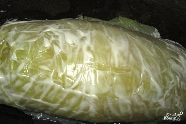 Аккуратно, чтобы не порвать капустные листья, сверните рулет. Старайтесь сворачивать его плотнее, чтобы после он не разваливался при нарезании. Скрученный рулет обмажьте со всех сторон майонезом.