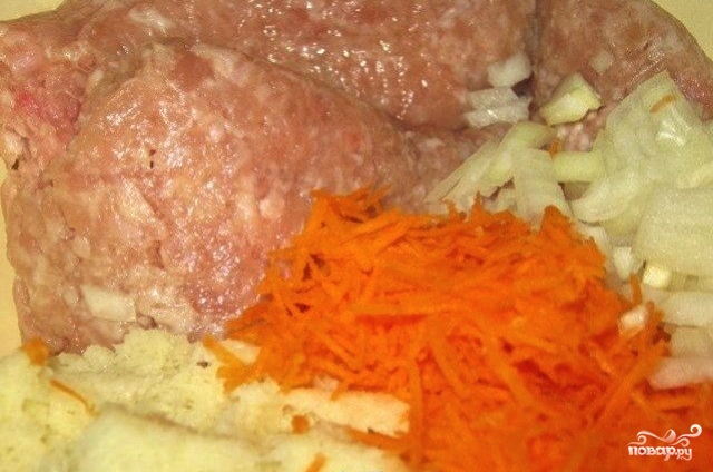 Подготовьте фарш. Морковь очистите и натрите на крупной тёрке. Луковицу очистите и мелко нарежьте. Чеснок продавите в чеснокодавке. Раскрошите хлебный мякиш. Всё это добавьте к мясному фаршу и хорошо вымешайте.