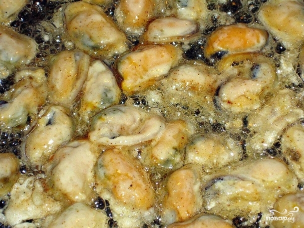4. Отправляем мидии во фритюр и жарим до готовности.
