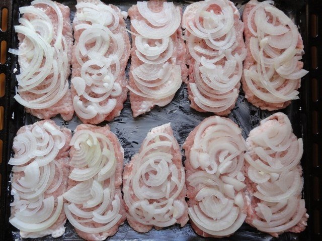 Лук очистить и нарезать тонкими полукольцами. Выложить на отбитое мясо довольно плотным слоем.