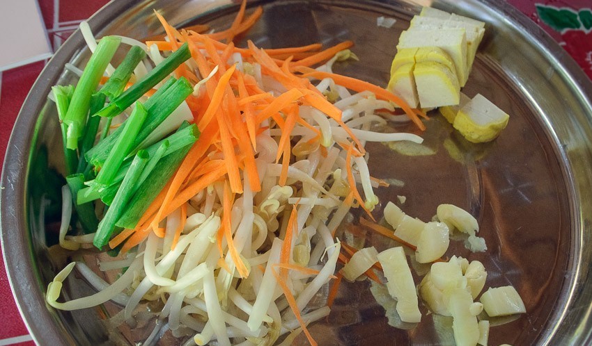 1. Подготовим ингредиенты: мясо разморозим, чеснок, морковь, тофу и лук порежем, лапшу отварим.