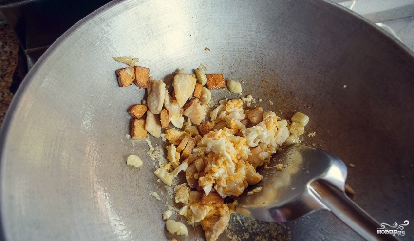 3. Теперь на кунжутном масле обжарим курицу, чеснок и сыр тофу. Когда зарумянятся - вбиваем яйцо, быстро перемешаем, чтобы яйцо схватилось хлопьями.