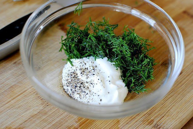 В небольшую миску вылейте сметану, добавьте черный перец, сахар и укроп. Влейте немного уксуса. Если вкус уксуса слишком терпкий, то добавьте еще немного сметаны и щепотку сахара (в пропорции).