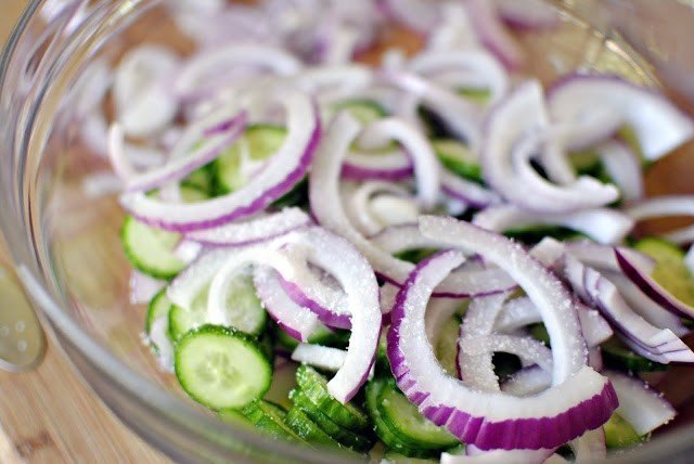 Тонко нарежьте огурцы. Красный лук очистите и тонко нарежьте полукольцами. Слой огурцов – слой лука – соль и т.д. Поставьте в холодильник часа на 2 (если предпочитаете, чтобы они были хрустящими).