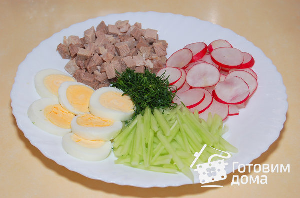 Соединить вместе в небольшой кастрюле: мясо, огурцы, редис, укроп и зеленый лук, растертый с солью.