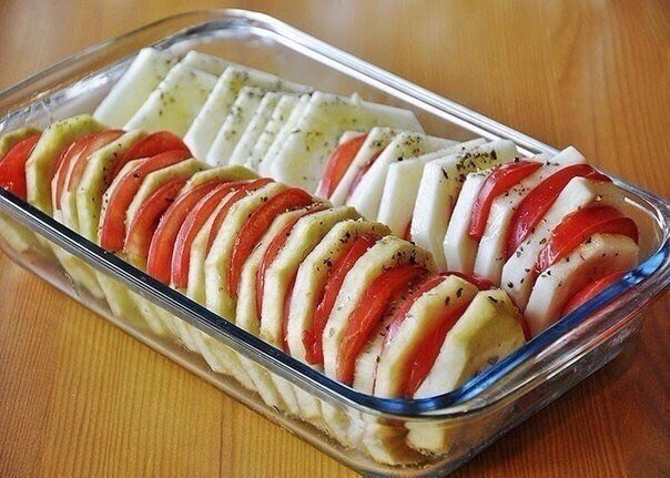 1. Помидоры и кабачки (баклажаны) тщательно промойте и нарежьте кружочками.