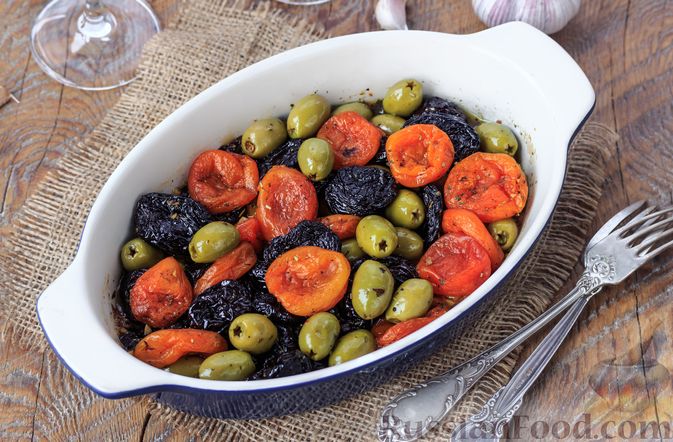 Рецепт простой в приготовлении закуски, которая покорит своим изысканным вкусом любого гурмана, - запечённые сухофрукты с оливками. Приправленные чесноком и ароматными травами, томленные в белом вине оливки получаются невероятно ароматными, а сухофрукты - нежными, сочными, солоновато-сладкими на вкус. |