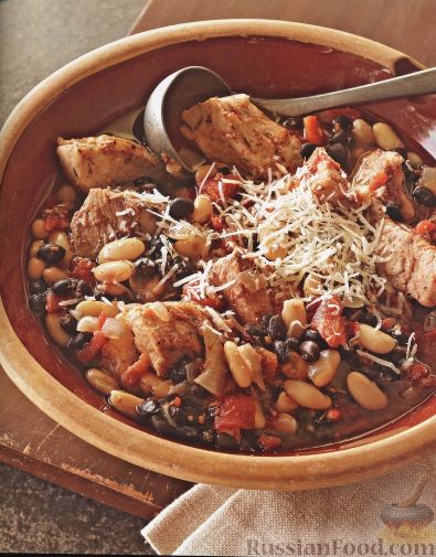 Рецепт сытного блюда - тушеная свинина с белой и черной фасолью. За счет того, что мясо томится несколько часов в медленноварке (или в мультиварке), оно получается очень мягким и вкусным. |