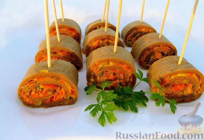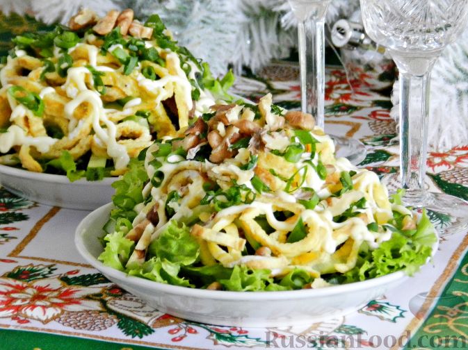 Салат "Римский" готовится с обжаренной говядиной, яичными блинчиками, свежими огурцами и орехами. Прекрасно подойдет этот мясной салат для новогоднего стола. |