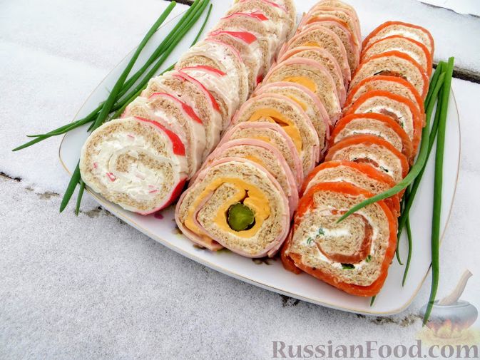 Три праздничных рулета (с красной рыбой, ветчиной и крабовыми палочками)