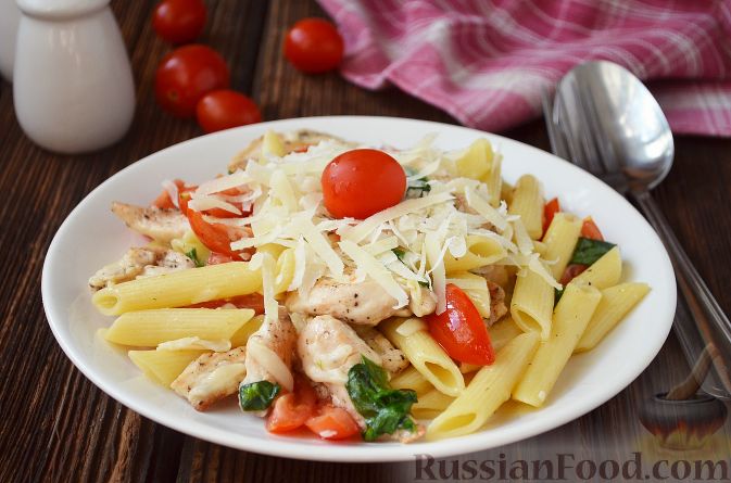 Паста с курицей, помидорами и шпинатом
