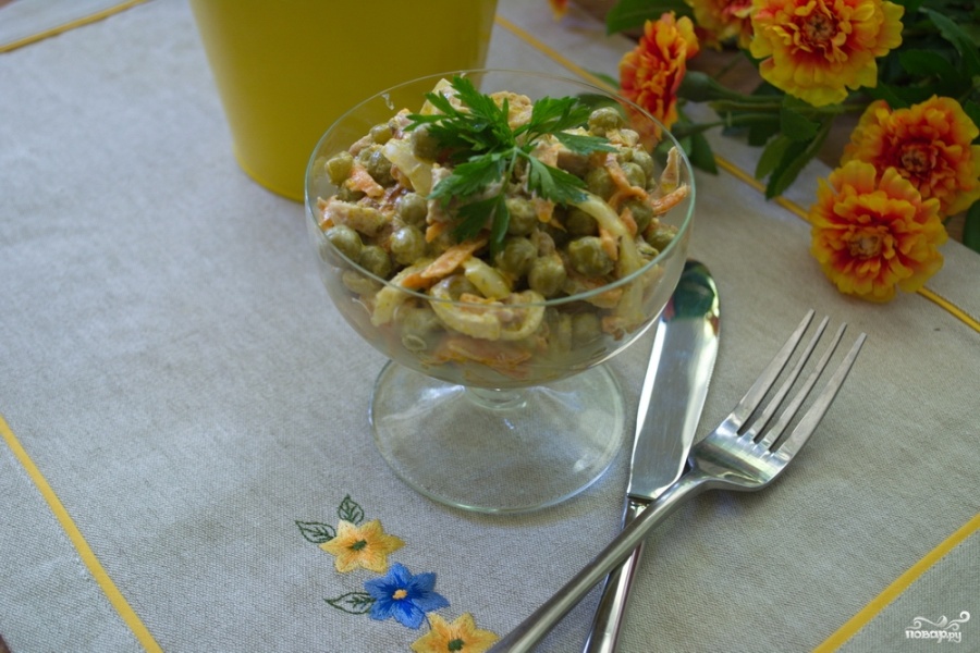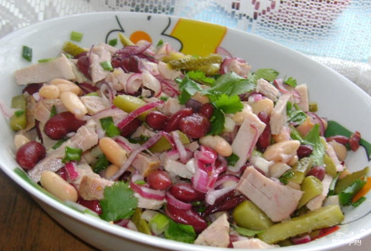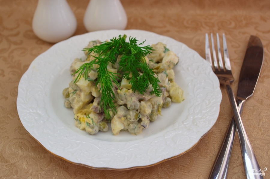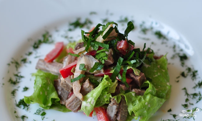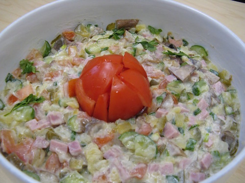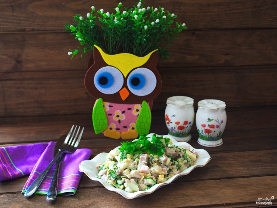 На вкус этот нежный салатик просто восхитителен, ветчина с яйцами придают ему сытности, а помидоры с огурцом — пикантности. Грибы, пережаренные с луком, добавляют необычности, остроты. Его можно приготовить и в обычный день для семьи, и на праздник, украсив сверху зеленью, зернами кукурузы и дольками помидора.