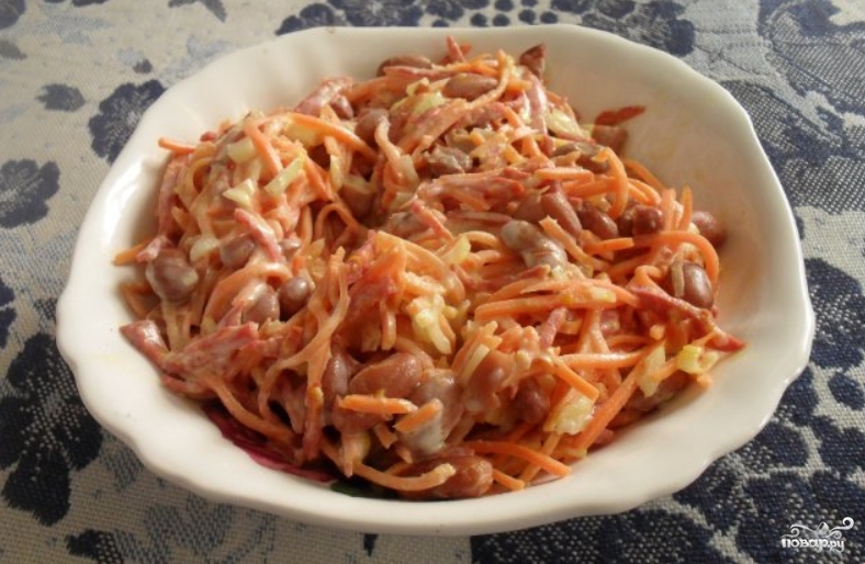 Этот салат часто подают на праздничный стол. Готовится он достаточно быстро, если у вас есть предварительно отваренная фасоль.