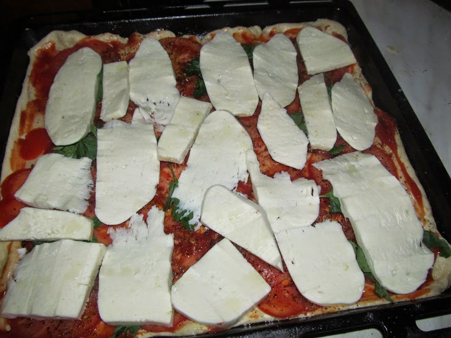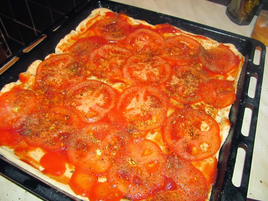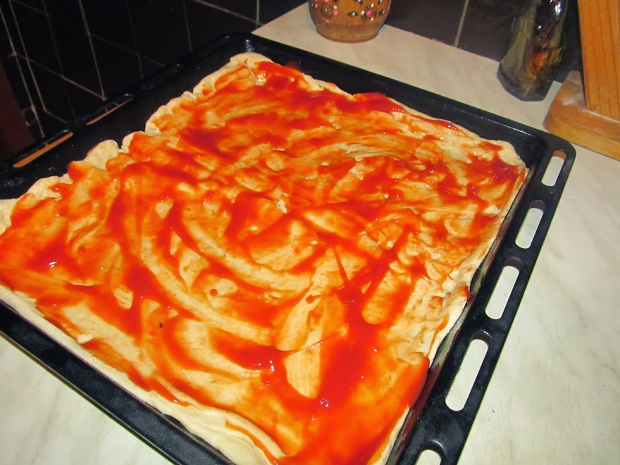 Шаг 1: Замесить тесто и дать ему подойти, тоненько раскатать и уложить на смазанный противень.
