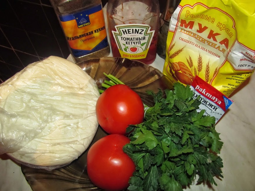 кетчуп, помидоры, 300-350 гр. сыр сулугуни, итальянская смесь (паприка, кориандр, базилик, орегано, перец черный, чеснок, куркума), петрушка свежая.