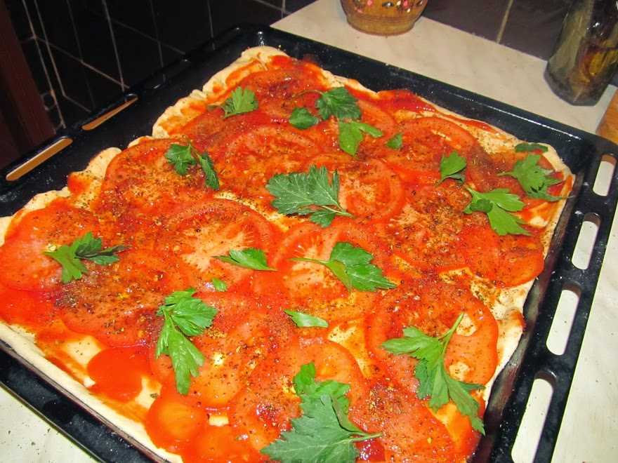 Шаг 2: Смазать кетчупом, уложить тонко нарезанные помидоры, посолить, посыпать специями, уложить листики петрушки и нарезанные широкие ломти сулугуни. Слегка побрызгать ароматизированным маслом.