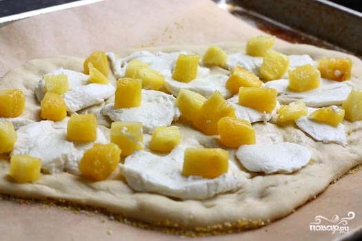 5. Выложить на тесто сыр и ананасы. Отправьте в разогретую духовку и запекайте 10-15 минут, пока тесто не подрумянится.