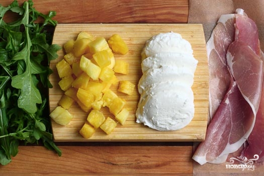 3. Вот такие основные ингредиенты. Нарежьте кружочками сыр, измельчите ананасы, вымойте и обсушите рукколу, подготовьте прошутто.