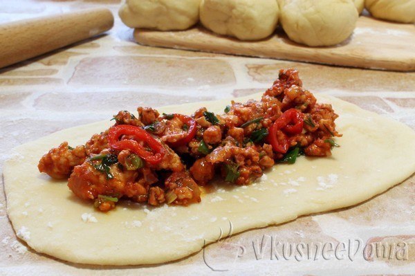 - Раскатываем каждую заготовку в тонкую, вытянутую лепешку. По центру распределяем мясную начинку.
