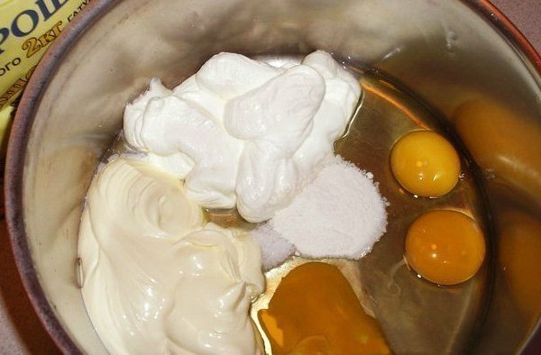 Смешиваем все ингредиенты, чтобы получилось не крутое и не густое тесто, густотой как для оладий. Количества муки может несколько варьироваться в зависимости от качества.