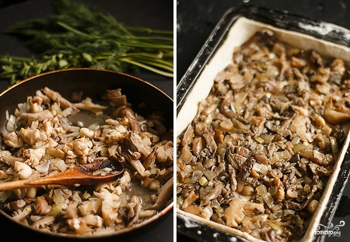 4. Посолите, поперчите грибы с луком. Снимите с огня, немного остудите и выложите в форму.
