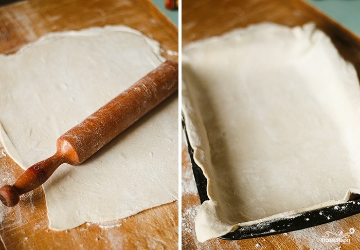 3. Пока начинка жарится, на присыпанной мукой поверхности раскатайте тесто и выложите его в жаропрочную форму.