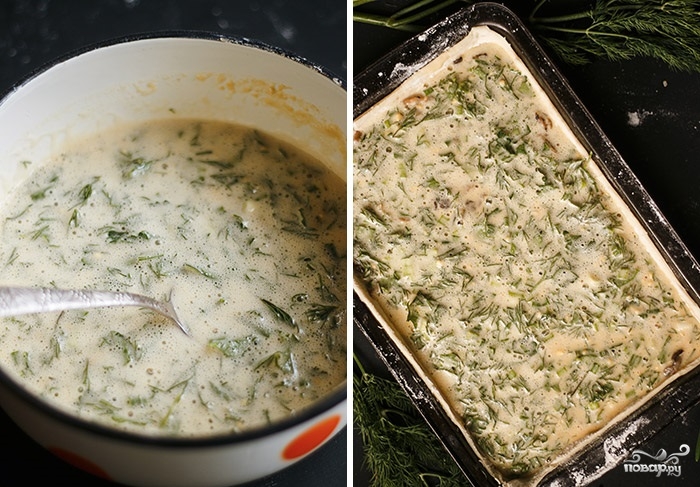 7. Добавьте зелень и как следует перемешайте до однородности. Вылейте заливки в форму и отправьте в разогретую духовку.