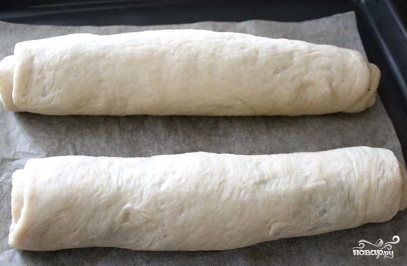 Через полчаса обомните тесто руками и раскатайте его в пласт. У вас должно получиться два пласта для двух порций рулета.