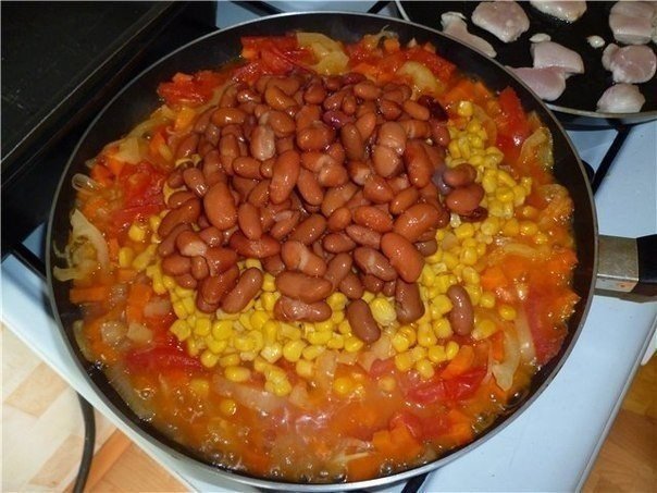 5. К овощам добавить кукурузу (если используется консервированная, то необходимо предварительно слить жидкость).