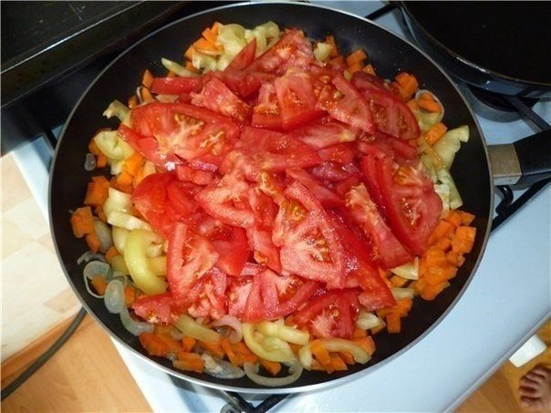 4. Помидоры порезать четвертькольцами, добавить к обжаривающимся овощам.