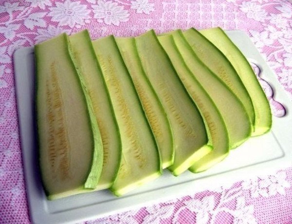 1. Помойте кабачки и разрежьте их вдоль на пластинки толщиной около 5 мм. Посолите и оставьте на 10 минут.