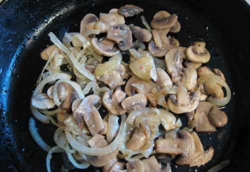 1) половину грибов с луком в центр формы.