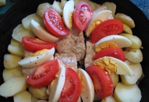 3) по кругу выложить кружки картофеля, а на рыбу по кругу дольки помидор и яиц, чередуя их между собой.