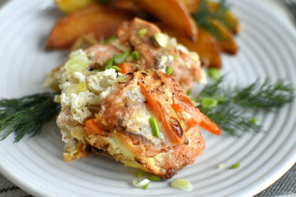 Выложите в керамическую форму слой рыбы, затем – слой овощей, который немного присыпать рубленым зеленым луком, и так далее. Рыбу чередуйте слоями по цвету – белую и красную. Поперчите по вкусу.